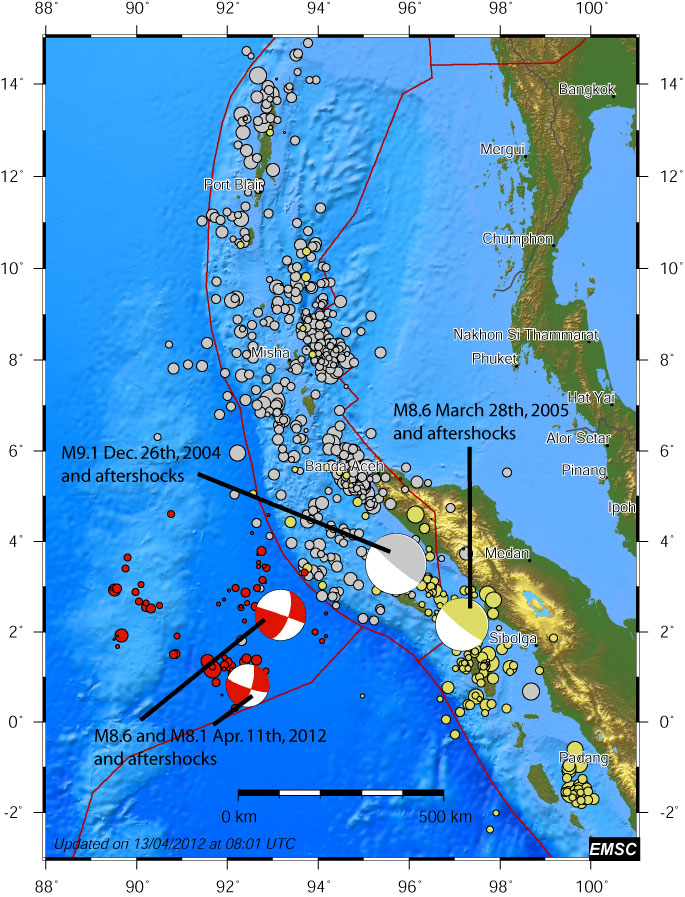 In Decembre 2004, a M9.3 earthquake caused a devastating tsunami which killed 230,000 people in more than a dozen countries. The 2012 April 11th event occurred 300km South West of the 2004 event.