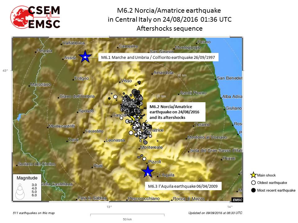 The main shock lies more or less between the epicenter of the April 6th, 2009 l'Aquila earthquake and of September 26th, 1997 Umbria and Marche earthquake. More information on the main shock is available here.