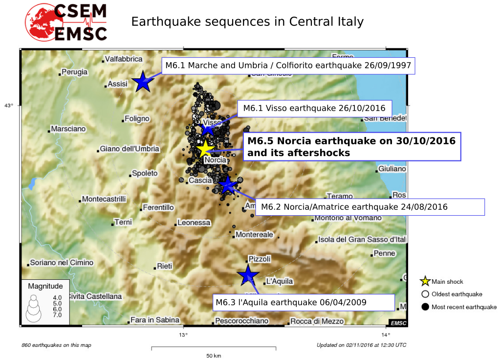 - On October 30th, at 07:40 local time, a magnitude 6.5 hit the region of Norcia causing important damage to cultural heritage. The Norcia's Basilica of San Benedetto is destroyed. Information on the main shock here.