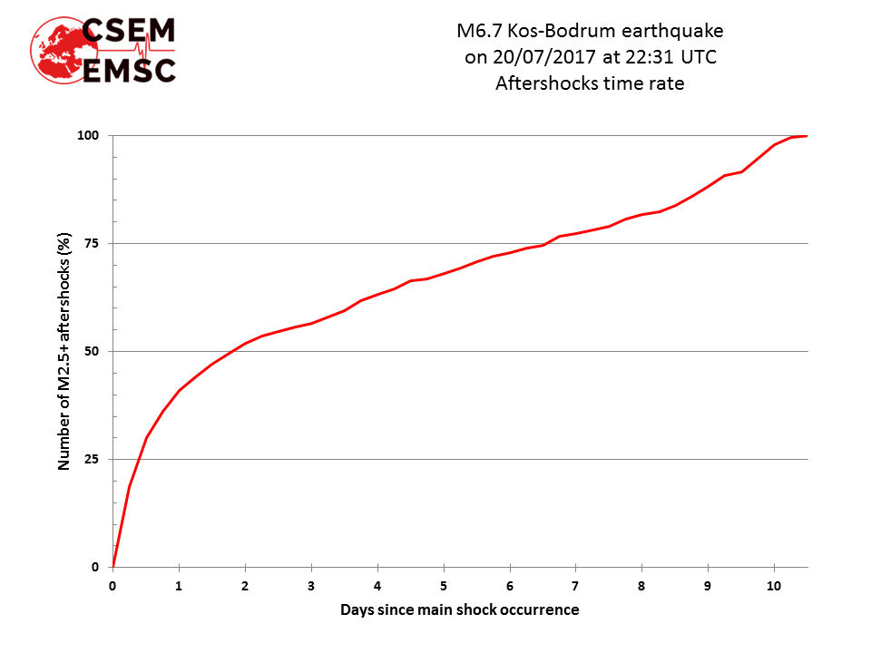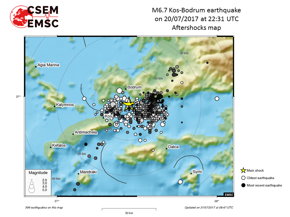 An earthquake of magnitude 6.6 hit Greek island of Kos, and Bodrum in Turkey (12 Km of epicenter) on Thursday 20 July 2017 at 22:31 UTC (01:31 local time). More information on the main shock is available here.