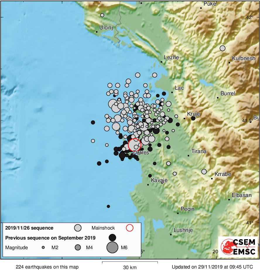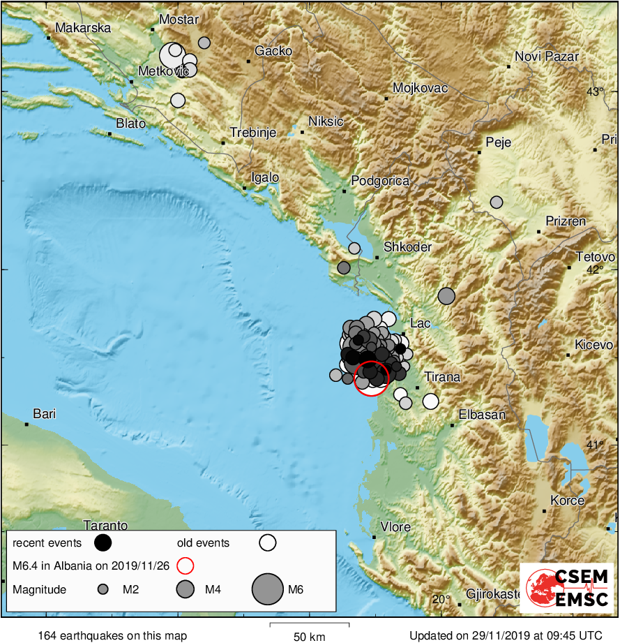An earthquake of magnitude M6.4 hit Albania, 34 km of Tirana in the night of Tuesday, November 26th 2019 at 2h54 UTC (3h54 in local time). Seismological information are available here.