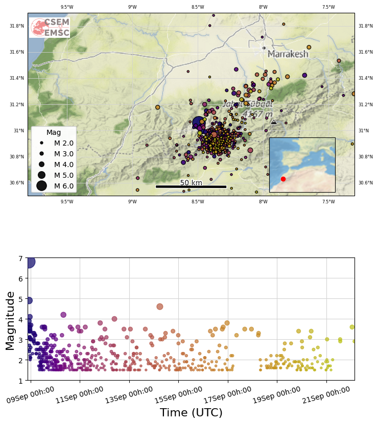 | Map of aftershocks using data from the Moroccan Institute CNRST updated on 2023-09-13. |